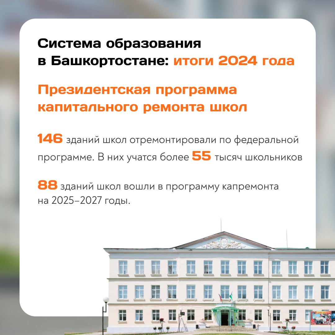 Помимо прочего, в 2025 году начнется работа в рамках уже региональной программы по модернизации учебных корпусов колледжей инициированной главой Башкирии Радием Хабировым. Здесь речь идет не только о ремонте, но и обновлении оборудования, благоустройстве территорий. Еще 7 общежитий попали в очередную федеральную программу. Что касается последнего, то активное участие Башкирии позволило войти в топ-3 в стране по числу ремонтируемых объектов.