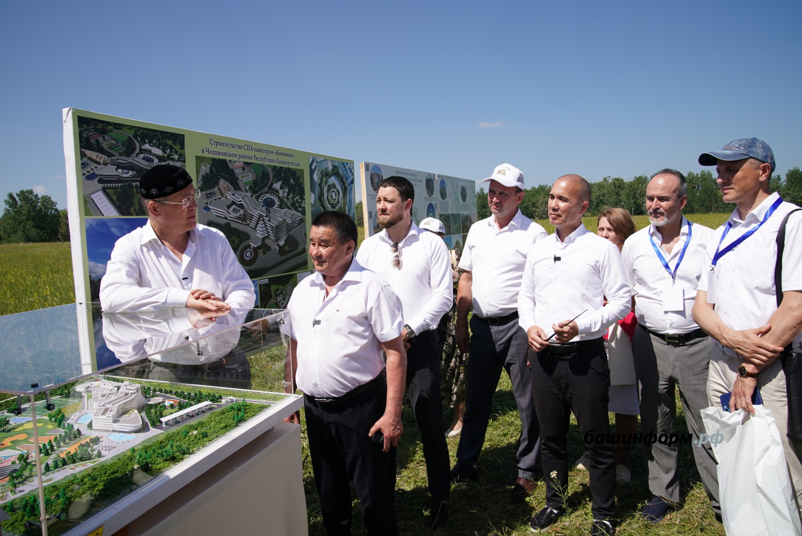 После презентации Радий Хабиров осмотрел место строительства будущего санатория. Архитектор проекта Максат Сапаев рассказал, что при разработке концепции авторы хотели показать красоту природных памятников Башкортостана – водопадов Гадельша и Куперля, горы Иремель, а также сот башкирских пчел.