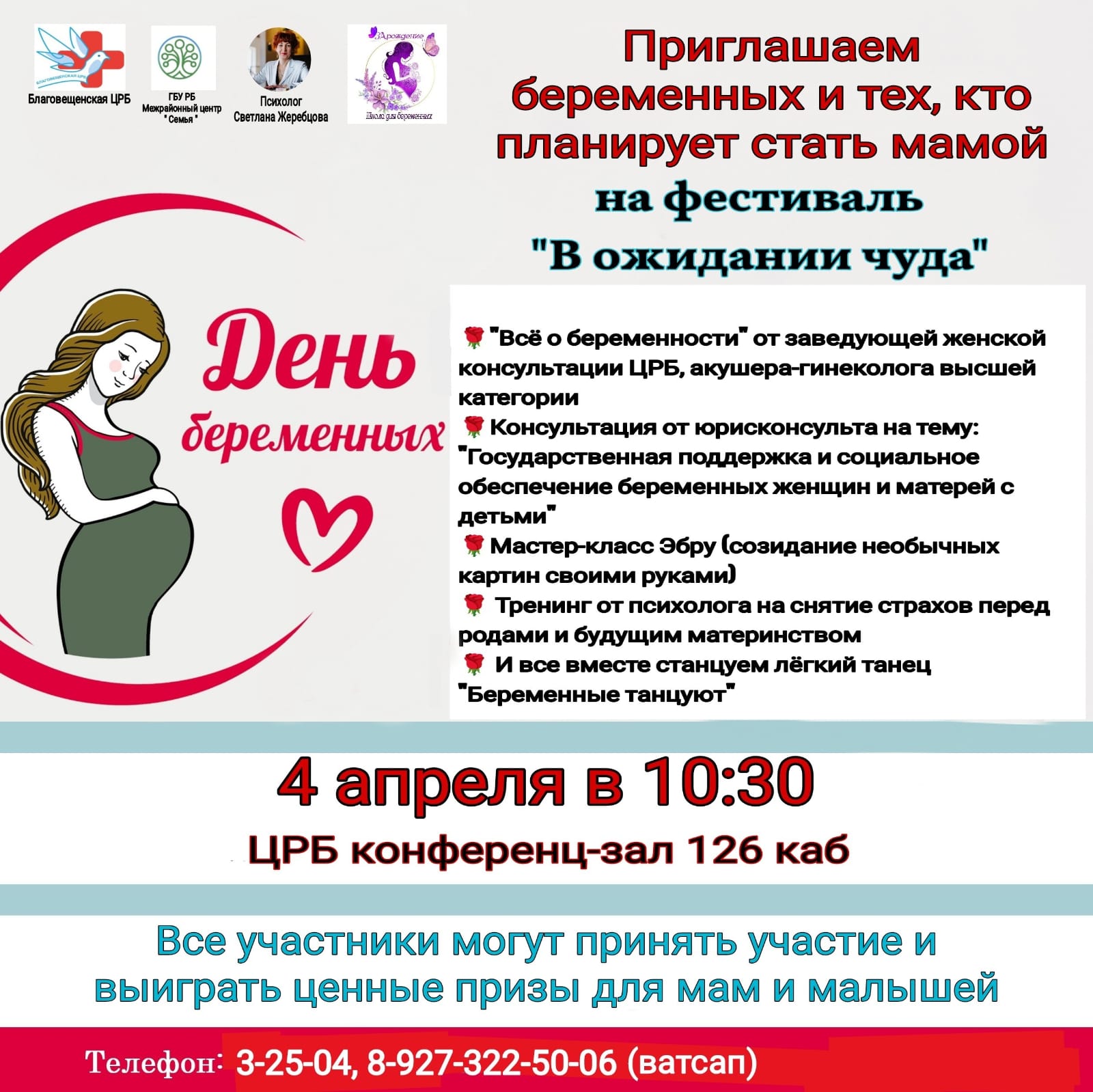 Приглашаем беременных и тех, кто планирует стать мамой на фестиваль "В ожидании чуда" 4 апреля в 10:30 ЦРБ конференц-зал 126 кабинет